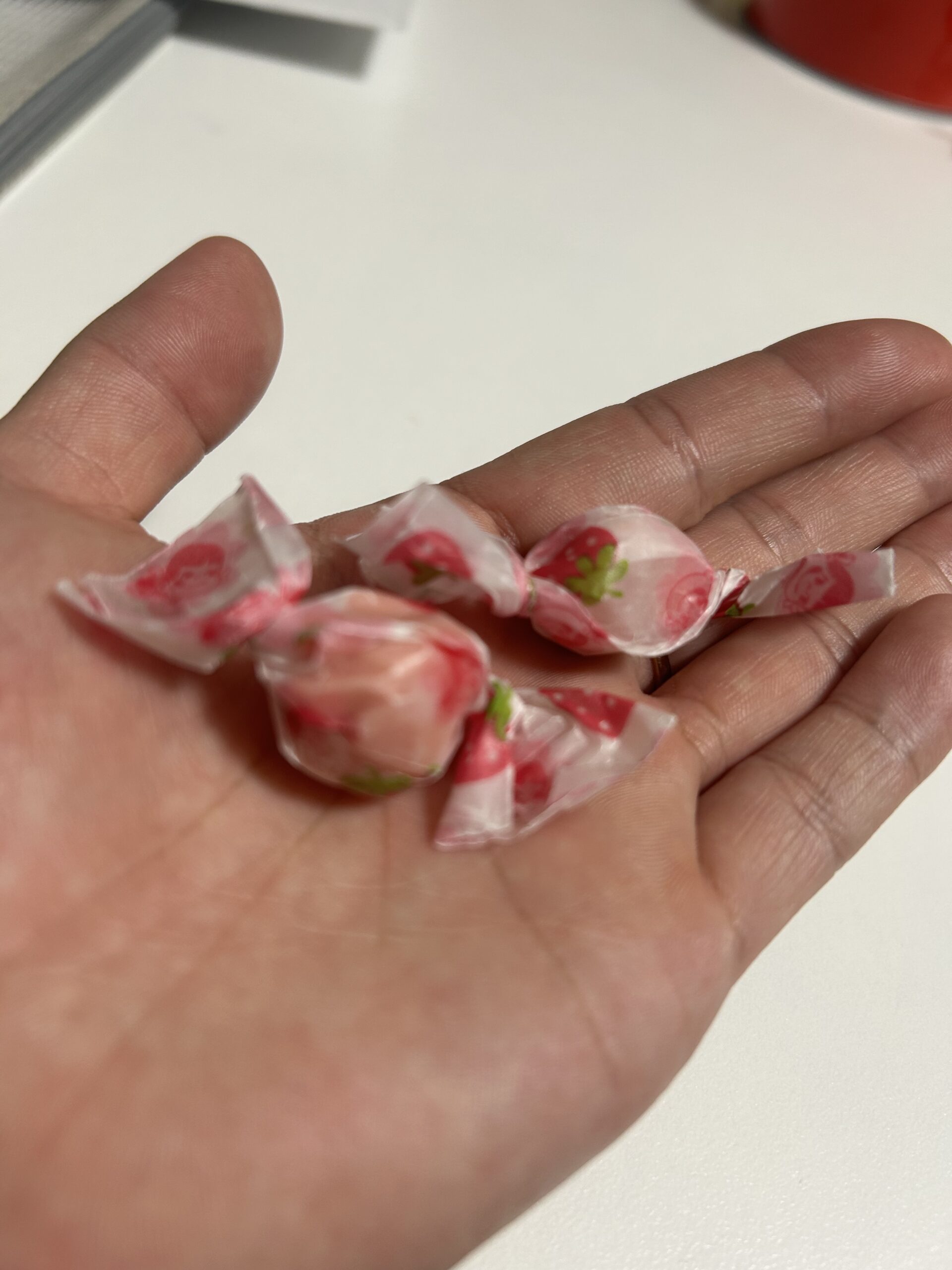 包み紙もいちごで可愛い🍓娘っちにって貰ったよ〜って帰宅してから渡したら、すぐ「食べて良い?」って😂