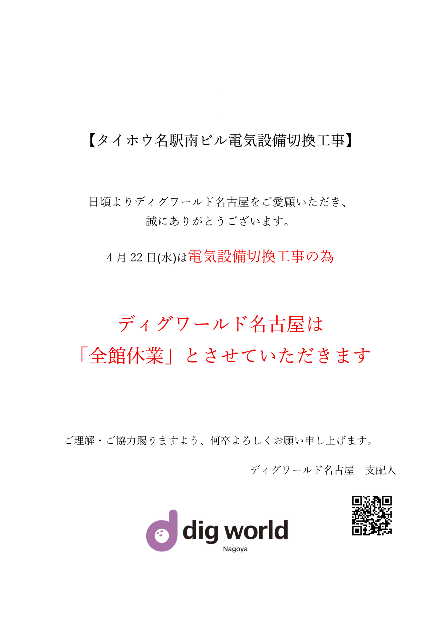 4月22日はタイホウ名駅南ビルの電気設備切替工事に伴い、全館休業となります。 予めご了承ください。